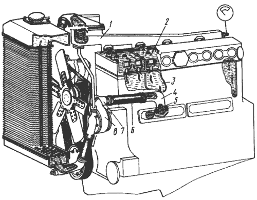 Изменена схема подвода охлаждающей жидкости к дизелю. Насос 16-08-140сп 8 системы охлаждения (рис. 53) перекачивает охлаждающую жидкость по патрубку 4 только в блок дизеля без ответвления в пусковой двигатель.