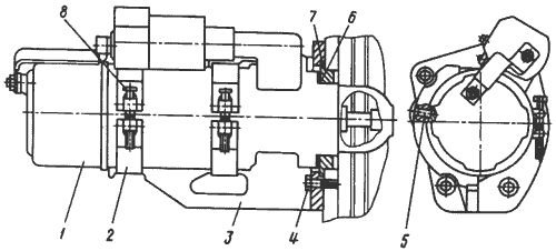 Стартер устанавливается на кронштейне 3 (рис. 55), укрепленном на кожухе маховика, фиксируется штифтом 5 и крепится к кронштейну двумя ленточными хомутами 2. При установке стартера на дизель выдерживать расстояние между привалочной плоскостью стартера и торцом зубчатого венца маховика (обращенным к стартеру), равное (46±0,14) мм и регулируемое прокладками 6.