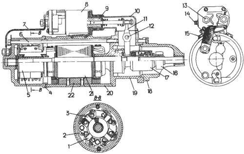 Стартер 251.3708 (рис. 54), представляет собой электродвигатель постоянного тока с принудительным вводом шестерни привода в зацепление с маховиком и самовыключением шестерни после пуска дизеля.