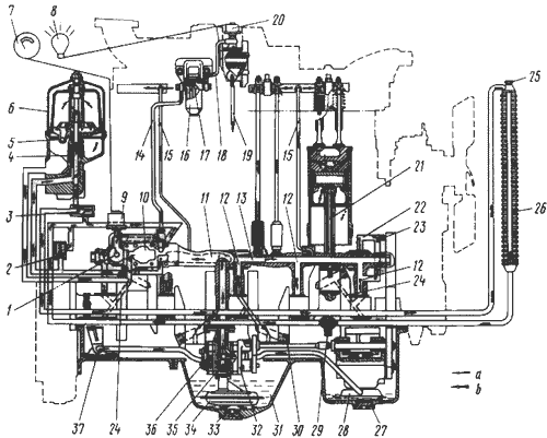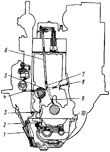Рис. 15. Схема системы смазки дизеля (продольный разрез)