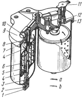 1-пробка; 2-кольца уплотнительные; 3-стержень стяжной; 4-уплотнение; 5-стакан; 6-элемент фильтрующий; 7-штуцер; 8-прокладка; 9-крышка; 10-заглушка; 11-вентиль продувочный; 12, 13-кольца уплотнительные; а-топливо, прошедшее очистку в фильтре грубой очистки топлива; b-топливо, прошедшее очистку в фильтре тонкой очистки.