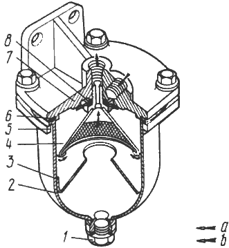 1-пробка сливного отверстия; 2-стакан фильтра; 3-успокоитель; 4-отражатель с фильтрующим элементом; 5-кольцо нажимное; 6-прокладка; 7-корпус фильтра; 8-кольцо; а-топливо, не прошедшее очистку; b-топливо, прошедшее очистку в фильтре грубой очистки.