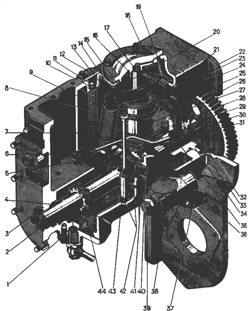 1-крышка; 2-вал регулятора; 3-втулка заднего подшипника; 4-сальник; 5-рычаг трехплечий; 6-тяга рейки; 7-упор минимальной частоты вращения; 8, 9-пружнны; 10-болт упора минимальной частоты вращения регулировочный; 11-втулка стопорная; 12, 37-крышки: 13-пружина; 14-болт упора максимальной частоты вращения регулировочный; 15-рычаг регулятора; 16-втулка; 17-вал вертикальный; 18-крышка подшипника; 19-трубка масло-подводящая; 20-ролик; 21-подшипник игольчатый; 22-шарикоподшипник упорный; 23-валик рычага регулятора; 24-муфта регулятора; 25-рычаг двуплечий; 26-шестерня привода регулятора; 27-груз регулятора; 28-шарикоподшипник упорный; 29-фланец; 30, 34-корпуса подшипников; 31-прокладки регулировочные; 32-плиты упорные; 33-шайба упорная; 35-втулка подшипника; 36-шестерня; 38-работомер; 39-отверстие дренажное; 40-валик трехплечего рычага; 41-шестерни конические привода работомера; 42-штифты направляющие; 43-упор максимальной частоты вращения; 44-шестерня.