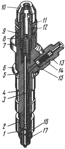 1-игла распылителя; 2-гайка распылителя; 3-штанга; 4-корпус форсунки; 5, 9, 17-кольца уплотнительные; 6-щиток; 7-пружины; 8-шайба; 10-колпак; 11-винт регулировочный; 12-контргайка; 13-штуцер; 14-элемент фильтрующий; 15-кольцо; 16-корпус распылителя.