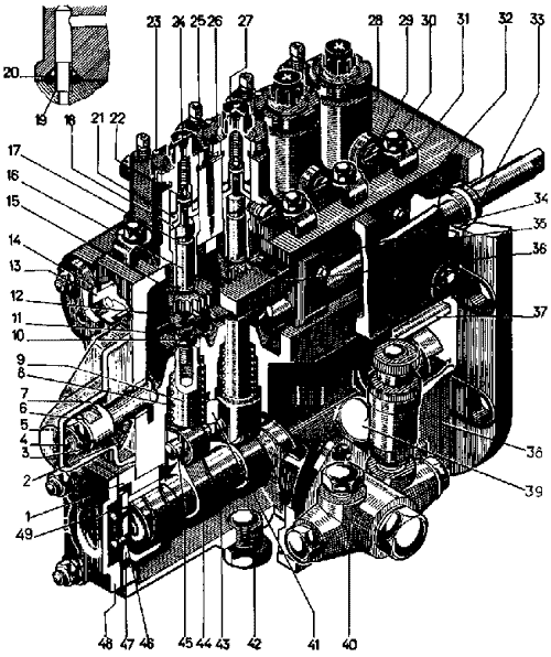 1-корпус подшипника; 2-пружина корректора; 3-контргайка муфты; 4-тяга рейки; 5-крышка корректора; 6-угольник стопорный муфты; 7-муфта регулирующая; 5-пружина толкателя; 9-толкатель; 10-контргайка толкателя; 11-тарелка толкателя; 12-хвостовик толкателя; 13-заглушка; 14-кольцо резиновое; 15-сектор зубчатый; 16-плунжер; 17-гильза; 18-седло обратного клапана; 19-трубка соединительная; 20, 21-кольца уплотнительные; 22-клапан обратный; 23-штифт; 24-пружина обратного клапана; 25-игла продувочного вентиля; 26-кольцо стопорное; 27-штуцер; 28-корпус секции; 29-винт стопорный; 30-болт; 31-угольник прижимной; 32-пластина направляющая; 33-кольцо тяги рейки упорное; 34-поводок рейки; 35-крышка бокового люка; 36-рейка; 37-втулка кулачкового вала передняя; 38-корпус насоса; 39-пробка заливного отверстия; 40-топливоподкачивающий насос; 41-палец толкателя направляющий; 42-пробка сливного отверстия; 43-ролик толкателя; 44-вал кулачковый; 45-ось ролика толкателя; 46-болт; 47-шайба упорная; 48-крышка подшипника; 49-пластина стопорная.