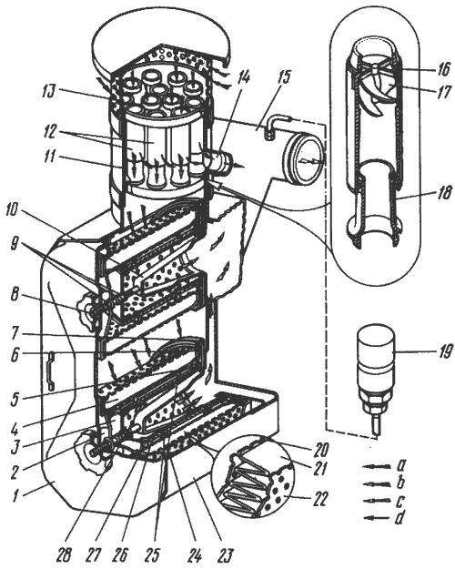 1-крышка воздухоочистителя; 2-крышка основного фильтр-патрона; 3-крышка предохранительного фильтр-патрона; 4-фильтр-патрон основной; 5, 6-кольца резиновые уплотнительные; 7-обойма; 8-шпилька; 9-гайка; 10-стойка стяжная; 11-корпус мультициклона; 12-циклоны прямоточные; 13-воздухозаборник; 14-патрубок отсоса пыли из поддона мультициклона; 15-патрубок подвода воздуха к турбокомпрессору; 16-корпус циклона; 17-завих-ритель; 18-конус циклона; 19-сигнализатор засоренности; 20-сетка внутренняя основного фильтр-патрона; 21-элемент фильтрующий; 22-сетка наружная основного фильтр-патрона; 23-корпус воздухоочистителя; 24-кольцо резиновое уплотнительное; 25-кольца стопорные; 26-чехол матерчатый; 27-каркас предохранительного фильтр-патрона; 28-фильтр-патрон предохранительный; а-воздух неочищенный; b-воздух, прошедший очистку в первой ступени воздухоочистителя (мультициклоне); с-воздух, прошедший очистку во второй ступени воздухоочистителя (фильтр-патронах); d-удаление пыли.