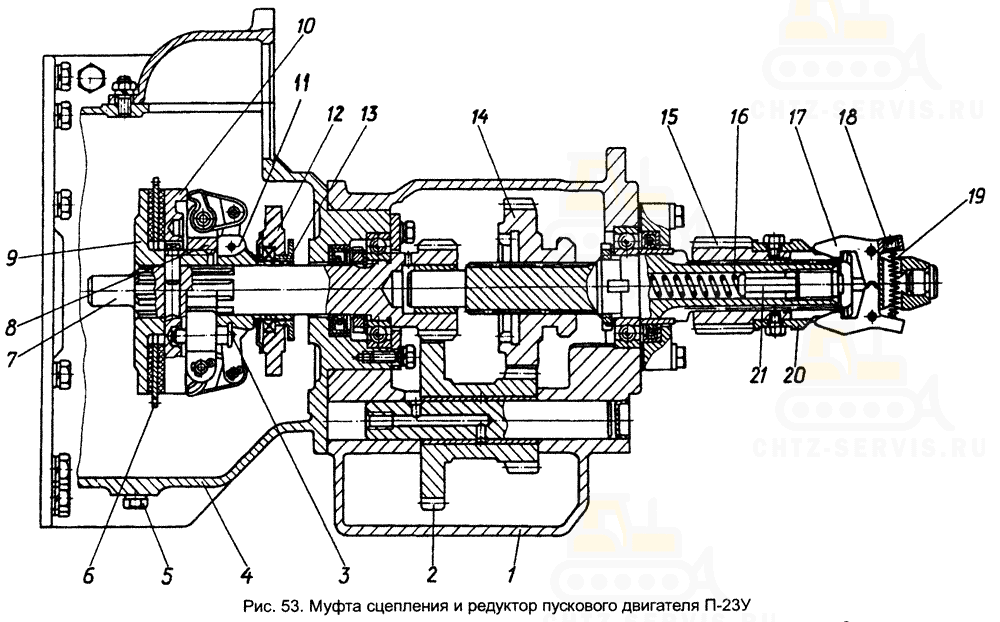 При слабом натяжении пружины 19 происходит преждевременное выключение шестерни 15 (шестерня выходит из зацепления раньше, чем дизель начнет работать). При сильном натяжении пружины происходит запаздывание выключения шестерни (дизель вращает пусковой двигатель на слишком большой частоте вращения), что может привести к аварии пускового двигателя.