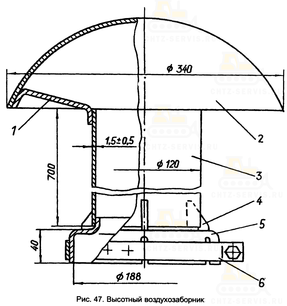 При эксплуатации дизеля в условиях высокой запыленности воздуха рекомендуется устанавливать на мультициклон воздухоочистителя высотный воздухозаборник, который снижает пылевую нагрузку на воздухоочиститель в три раза. Высотный воздухозаборник изготавливается силами эксплуатирующей организации в соответствии с рис.47.