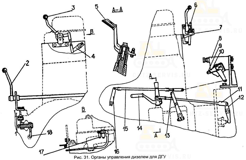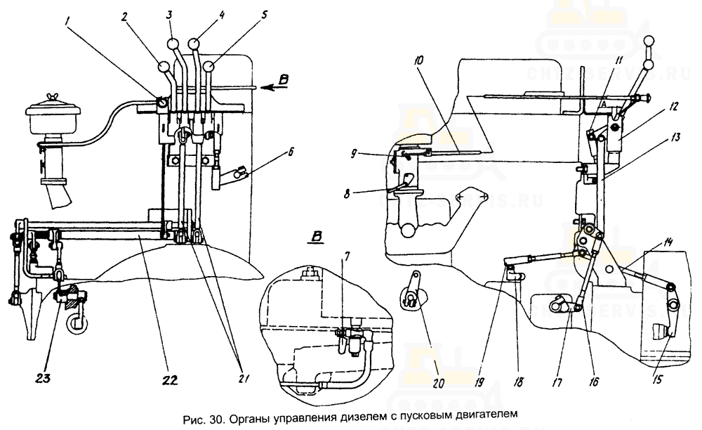 Рычаги управления дизелем с пусковым двигателем объединены в блок управления 12 (рис. 30):