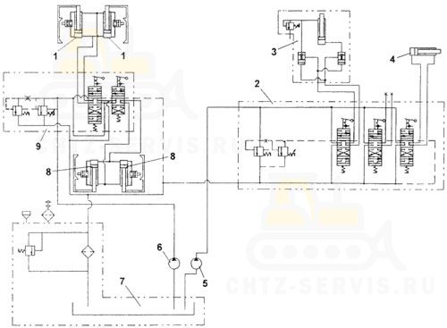 1-гидроцилиндр подъема и опускания отвала бульдозера; 2, 9-гидрораспределитель; 3-гидроцилиндр перекоса 749-72-240СП отвала с гидрозамком и предохранительным клапаном; 4-гидроцилиндр изменения вылета зуба рыхлителя; 5-гидронасос; 6-гидронасос; 7-гидробак; 8-гидроцилиндр 749-72-189СП подъема и опускания рыхлителя