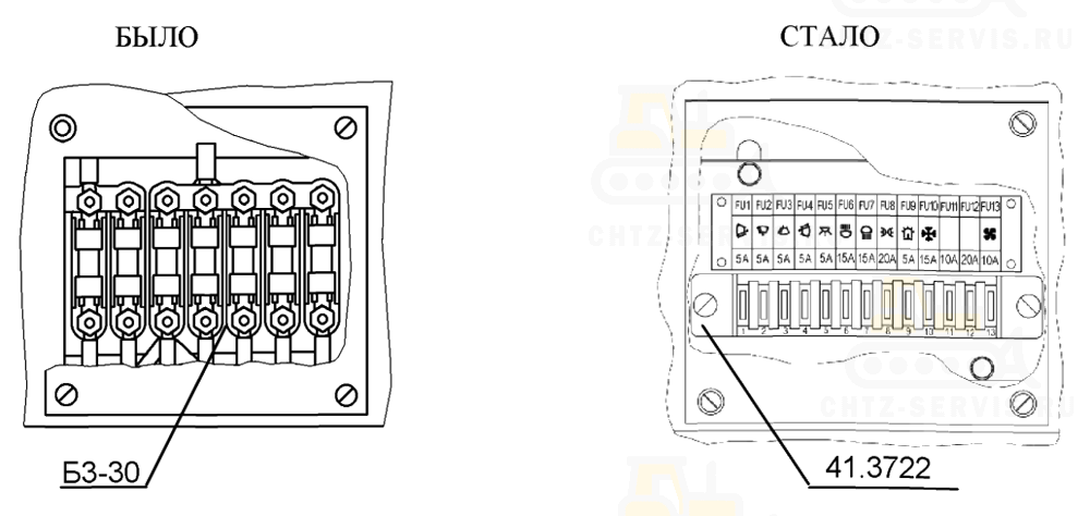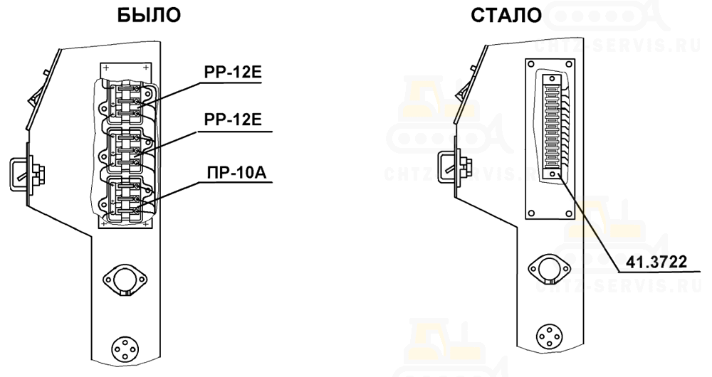 Для удобства обслуживания трактора ДЭТ-320 и повышения надежности три блока предохранителей РР-12Е (2 шт.) и ПР-10А заменены одним новым блоком предохранителей 41.3722.