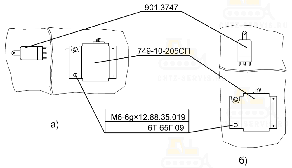 - на задней стенке кабины под реле 901.3747, рис. б) - для трактора ДЭТ-250М2.