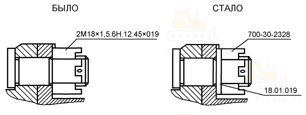 С целью повышения надежности соединения фрикционной и соединительной муфт и унификации гаек, взамен гаек 2М18×1,5.6Н.12.45×019 установлены 700-30-2328 (6 шт.). При этом введены шайбы 18.01.019.