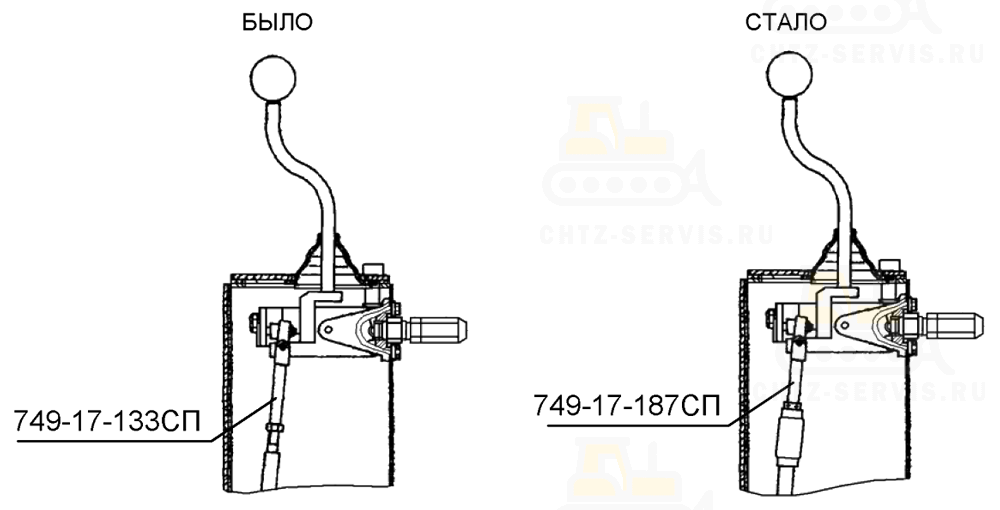 Для обеспечения доступа через люк к регулировочным муфтам 748-17-364СП и снижения трудоемкости регулировок тяг в эксплуатации изменена длина тяг 749-17-155СП и 749-17-156СП привода управления трактором ДЭТ-320.