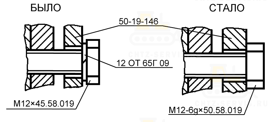 При этом болты М12х45.58.019 (6 шт.) замены болтами M12-6gx50.58.019 большей длины, шайбы 12 ОТ 65Г 09 (6 шт.) аннулированы. Обозначение крышки сохранено.
