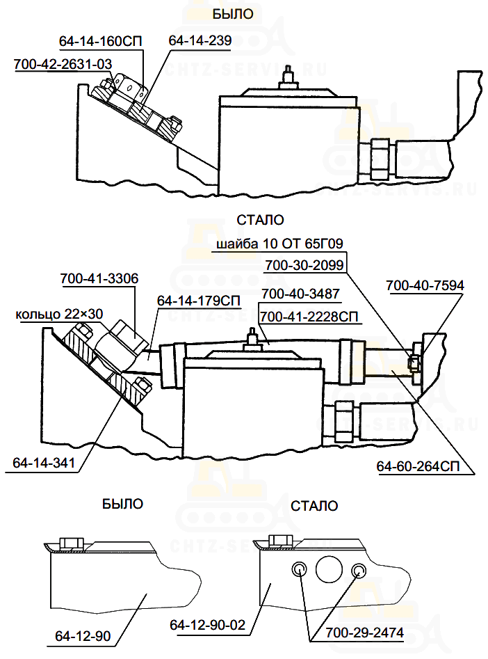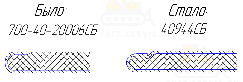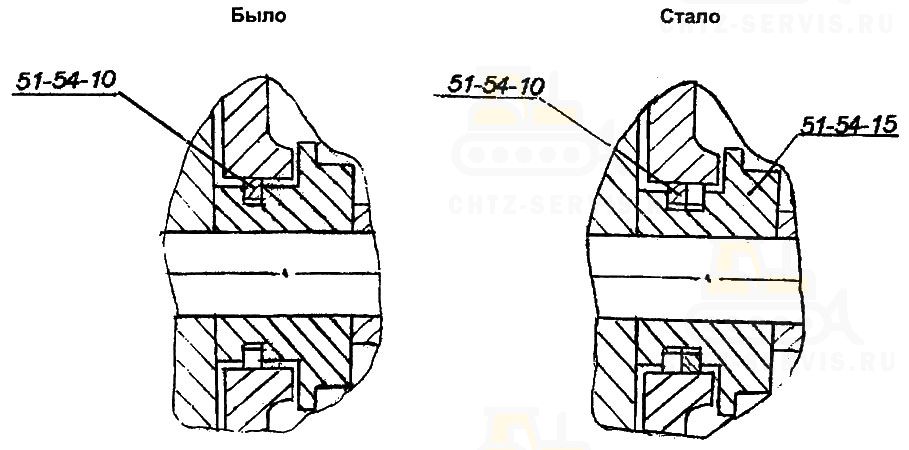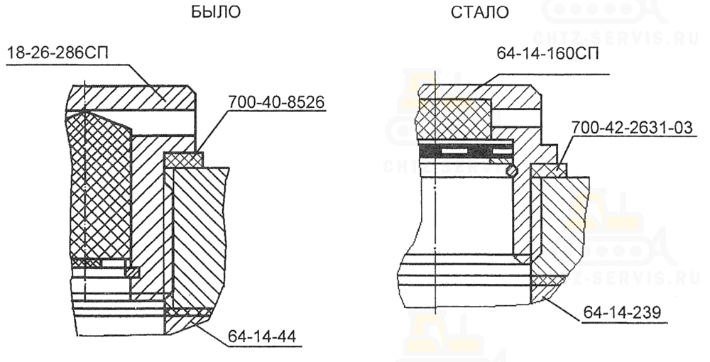 С целью устранения течи масла через уплотнения в трансмиссии взамен колец из обычной резины 700-40-4785 (прифланцовка КП и корпуса бортовых фрикционов) и 700-40-8073 (в ГТР) установлены кольца из фторсиликоновой резины ФС-608, соответственно 700-40-9573 и 700-40-9572.