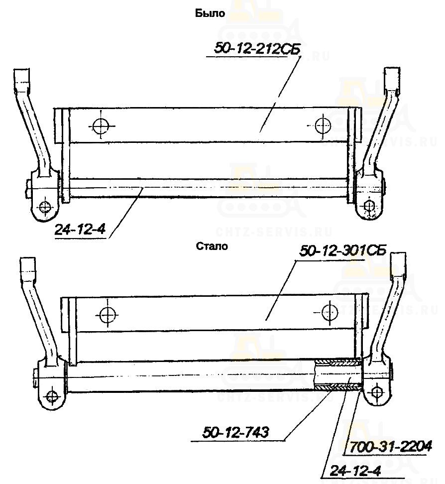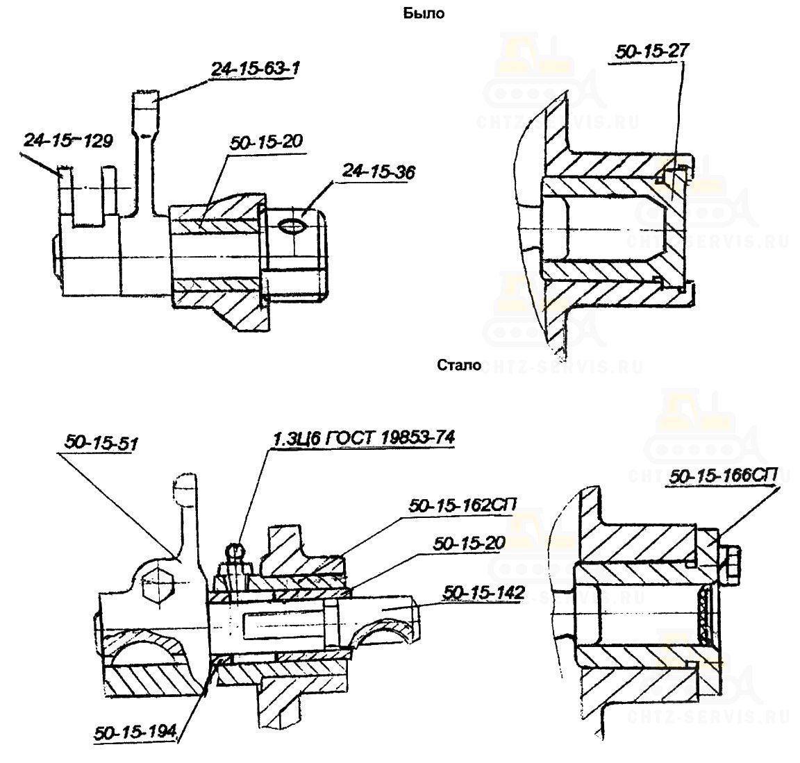- установленная во втулку 50-15-20 ось 24-15-36 с рычагами 24-15-129 и 24-15-63-1 заменена валиком 50-15-142 с рычагом 50-15-51. Валик установлен в двух втулках 50-15-194 и 50-15-20 (входящих во втулку 50-15-162СП), смазываемых через масленку 1.3 Ц6 ГОСТ 19853-74.