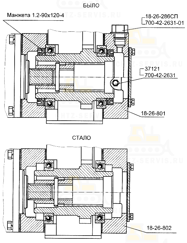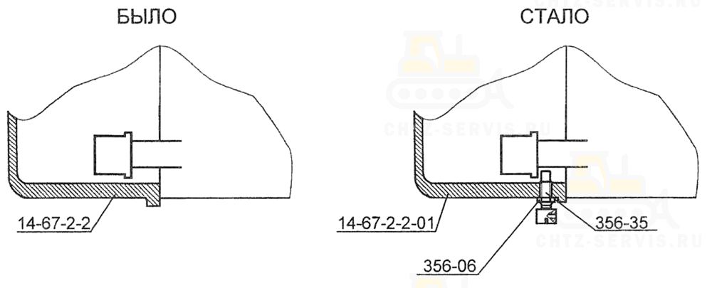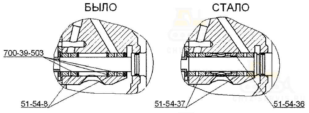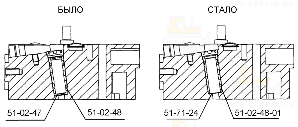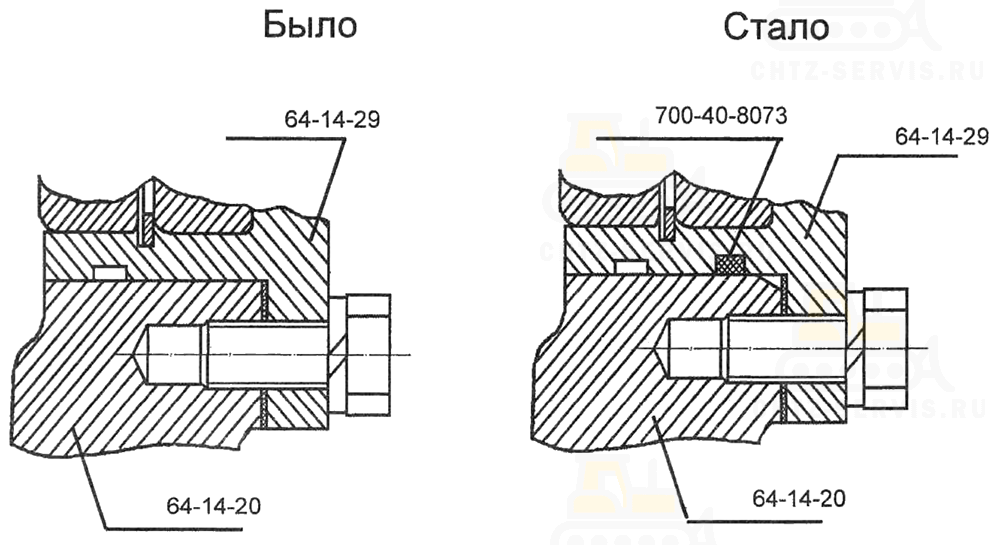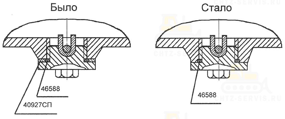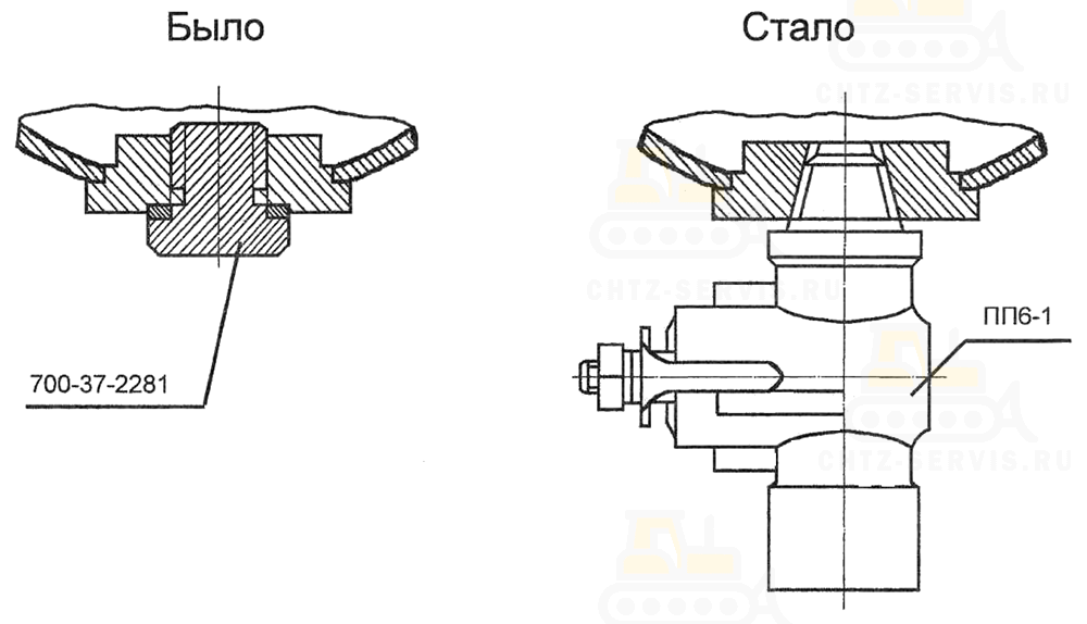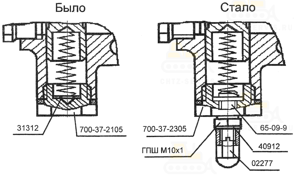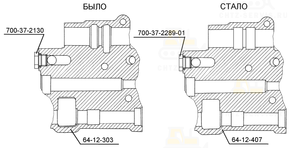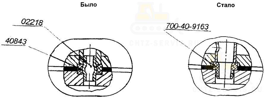 В связи с установкой нового корпуса, а также с целью унификации с пробками, применяемыми в узлах трансмиссии трактора, взамен пробок 700-37-2130 установлены пробки 700-37-2289-01.