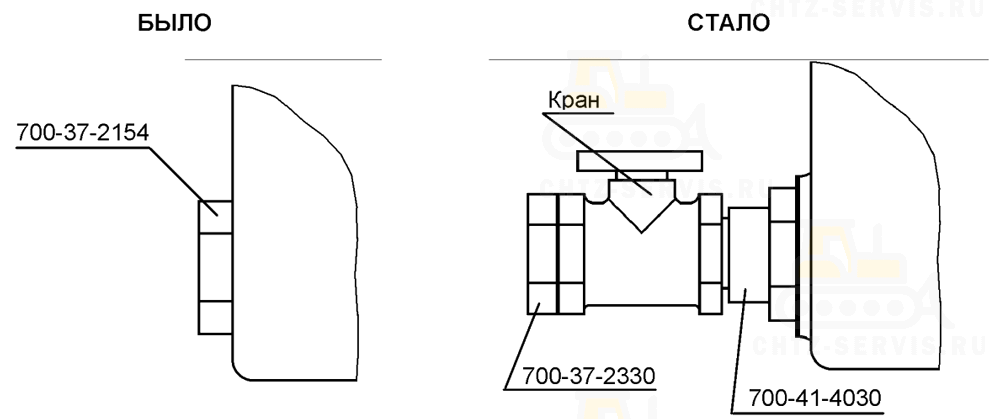 В ЗИП прикладывается патрубок 700-41-4031, который устанавливается при сливе масла взамен пробки 700-37-2330, закрывающей резьбовое отверстие крана.