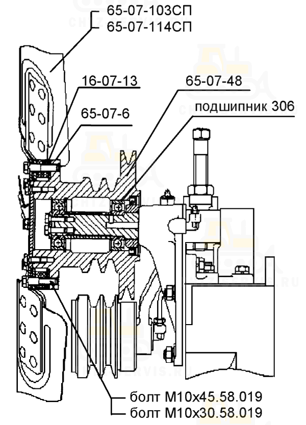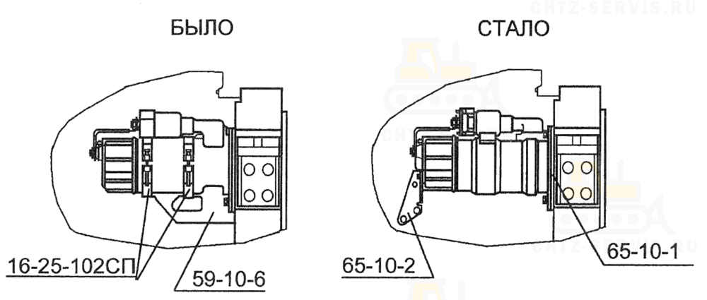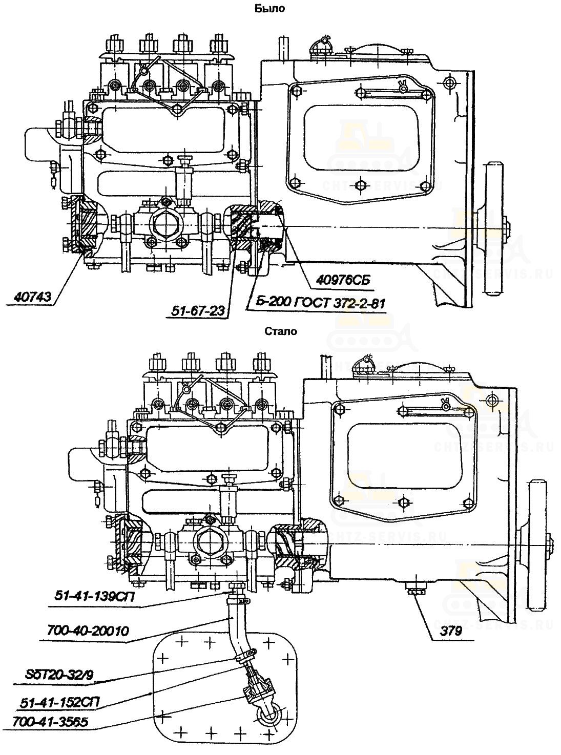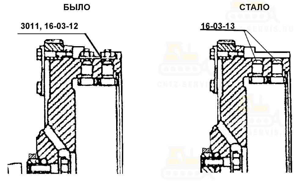 С целью исключения случаев самоотворачивания гайки 700-30-2327 на стержне 50-17-157, стягивающем двойную шестерню, увеличены длина стержня и высота гайки. Момент затяжки гайки увеличен.