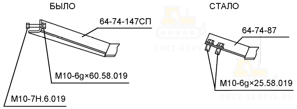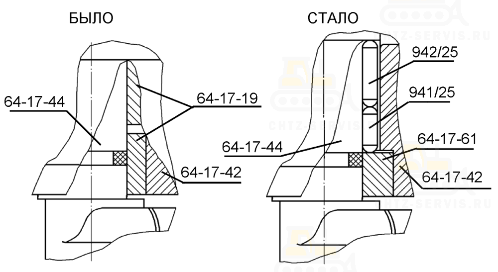 Для снижения усилия на рукоятке рычага управления поворотом и повышения надежности привода сервомеханизма 64-17-2СП управления бортовыми фрикционами введена установка валиков 64-17-44 на игольчатых подшипниках 941/25 и 942/25 вместо железографитовых втулок 64-17-19 (4 шт.).