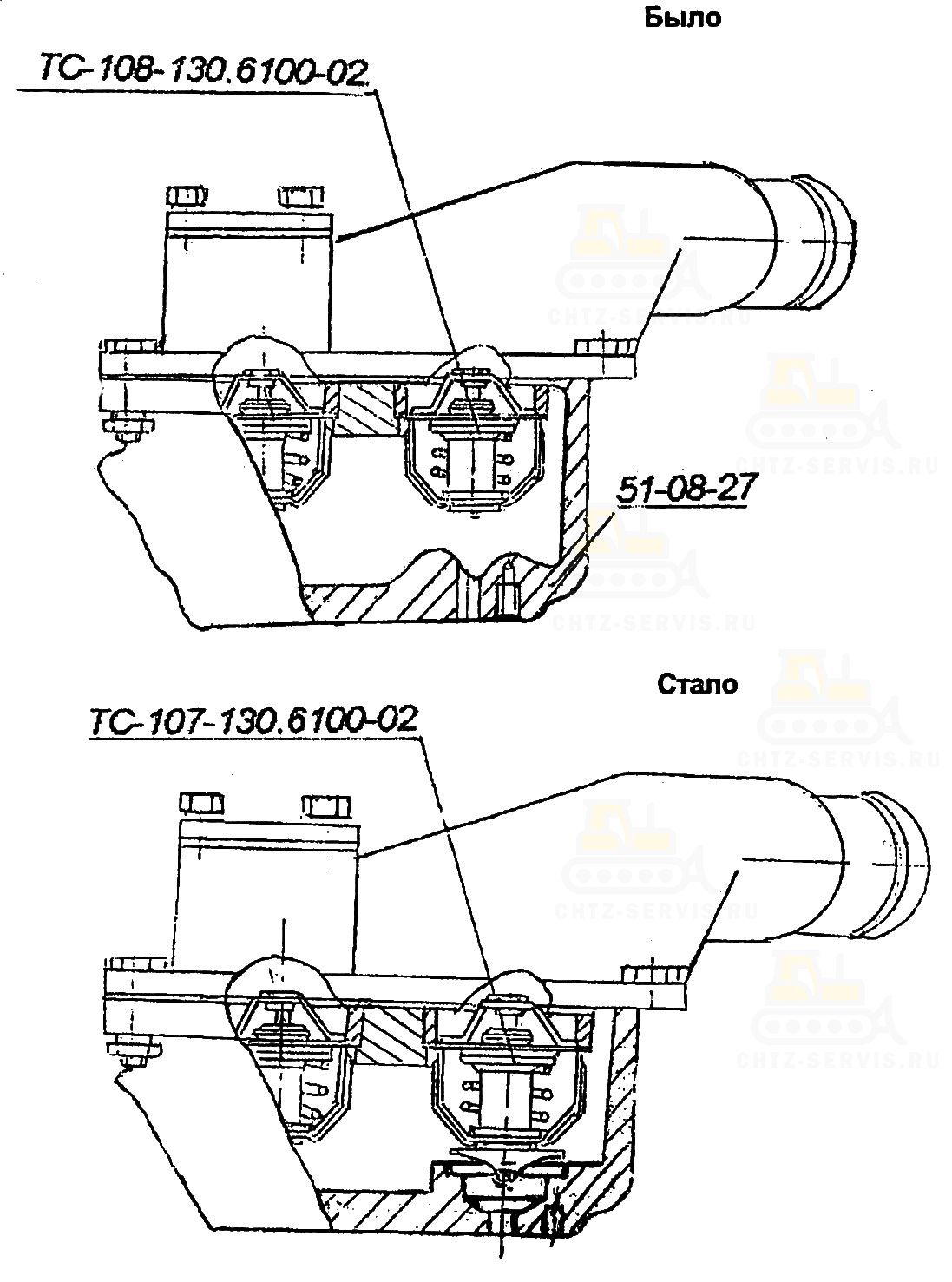 С целью улучшения работы системы охлаждения дизеля введены термостаты двойного действия ТС-107-130.6100-02 взамен ТС-108-130. 6100-02, с изменением размеров трубы 51-08-27, в которую они вставляется, и сохранением ее обозначения.
