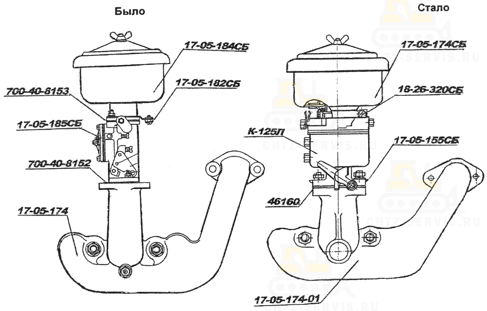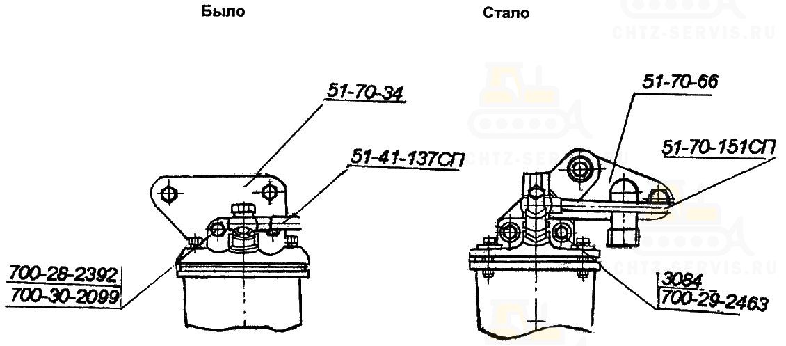 Для установки его на ранее выпущенных тракторах следует заменить крышку 64-14-44, на которую крепится сапун, и прокладку 700-40-8526 на новые соответственно 64-14-239 и 700-42-2631-03.