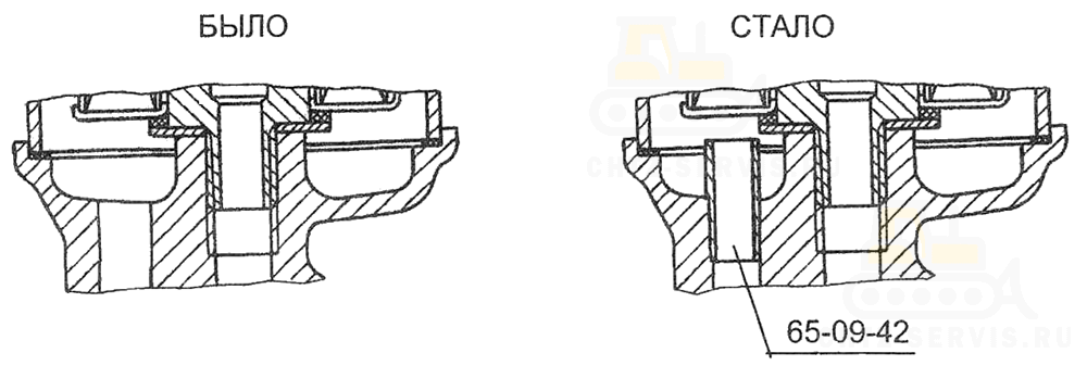 Для устранения случаев падения давления в системе смазки планетарной коробки передач из-за выпадания седла 64-12-39 клапана смазки 64-12-112СП, ужесточена его посадка за счет изменения размера посадочного отверстия в корпусе.