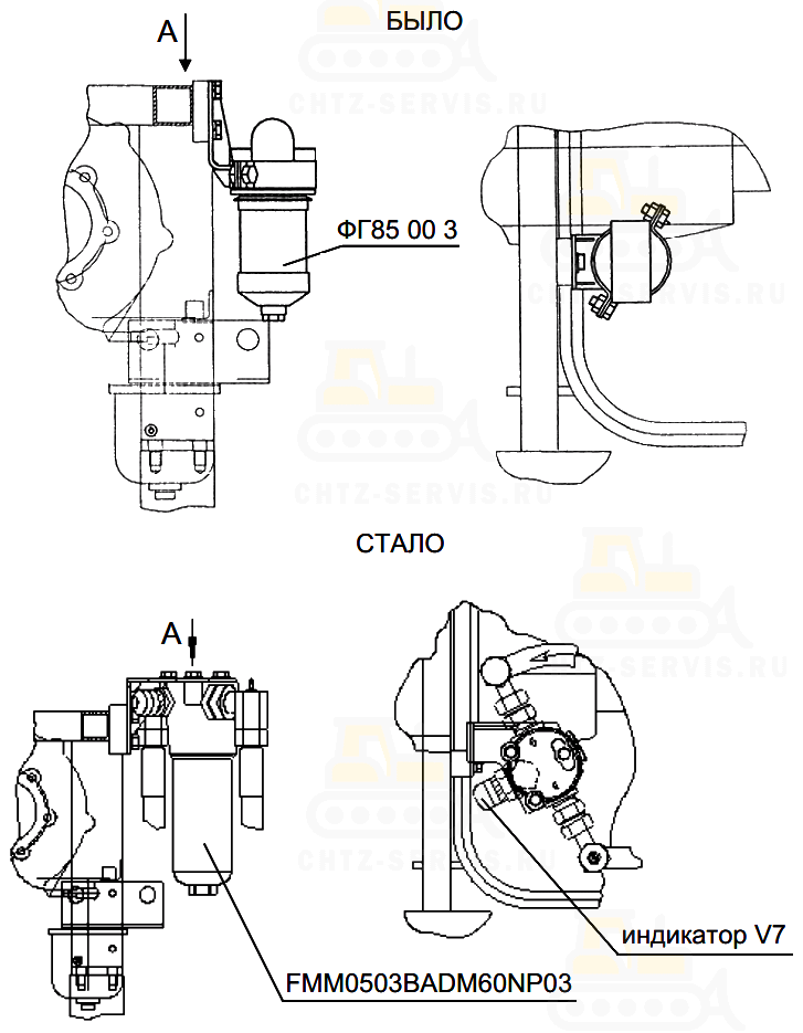 Для улучшения качества масла, поступающего в гидросистему питания, управления и смазки ГМТ тракторов Т10М с двигателем ЯМЗ, установлен фильтр FMM0503BADM60NP03 с перепускным клапаном и визуальным индикатором V7 засоренности взамен ранее устанавливаемого фильтра ФГ85 00 3.