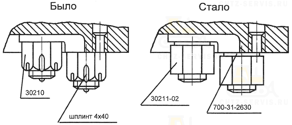 С целью обеспечения стабильности и бесступенчатой затяжки гаек крепления крышек коренных подшипников отменена их шплинтовка, при этом аннулированы шплинты 4x40, гайки 30210 заменены гайками 30211-02 и введены закаленные шайбы 700-31-2630.
