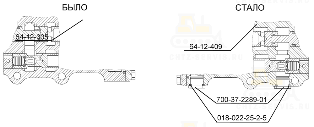На тракторах с гидромеханической трансмиссией взамен корпуса 64-12-305 блока клапанов установлен корпус 64-12-409, с полностью механически обработанными каналами.