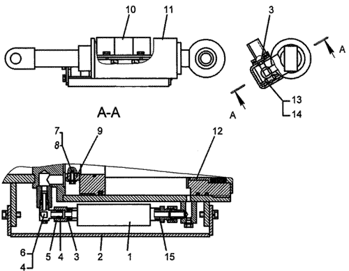 1-гидрозамок; 2-кожух; 3-кольцо; 4-кольцо; 5-компенсатор; 6-угольник; 7-шайба; 8-винт стопорный; 9-гайка; 10-ограждение; 11-гидроцилиндр; 12 -втулка; 13-гайка; 14-шпилька; 15-штуцер