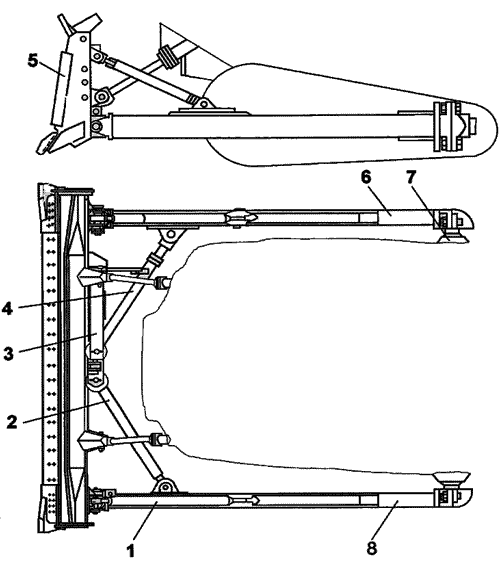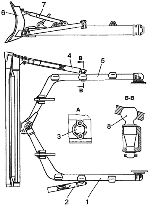 1-раскос винтовой; 2-тяга; 3-балка; 4-подкос; 5-отвал прямой; 6, 8-брус толкающий; 7-опора шаровая.