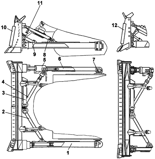 1,6-брус толкающий; 2-тяга; 3-балка; 4-подкос; 5-гидрораскос; 7-опора шаровая; 8-раскос винтовой; 9-стопор; 10-отвал полусферический; 11-рукоятка винтового раскоса; 12-отвал прямой