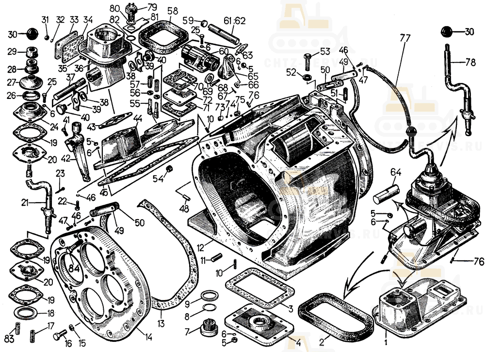 Корпус коробки передач с крышками и механизм переключения передач на Т-130