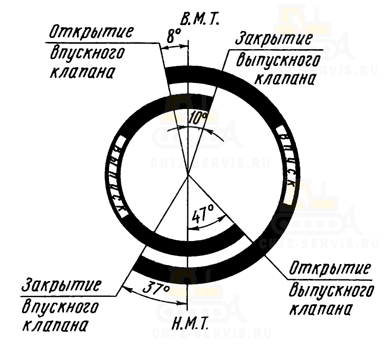 Двигатель работает по четырехтактному циклу. Каждый цикл осуществляется за два оборота коленчатого вала.