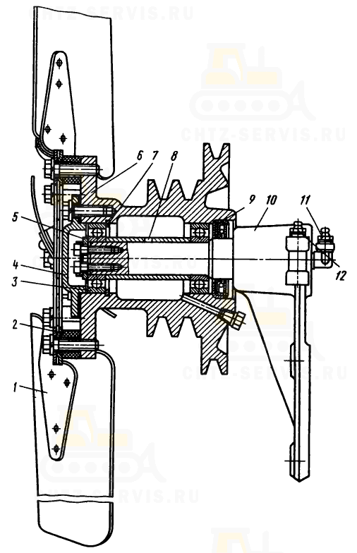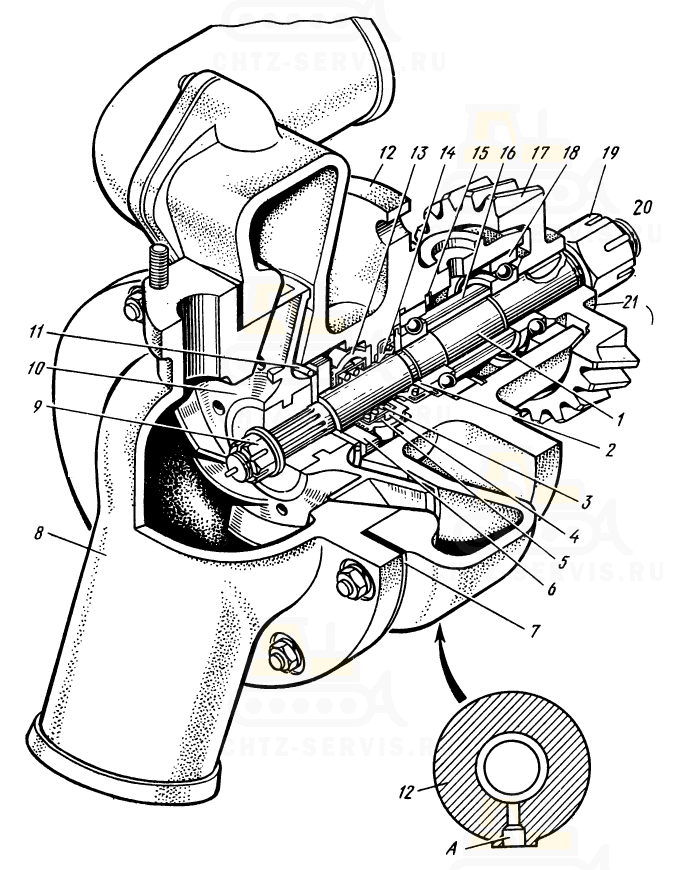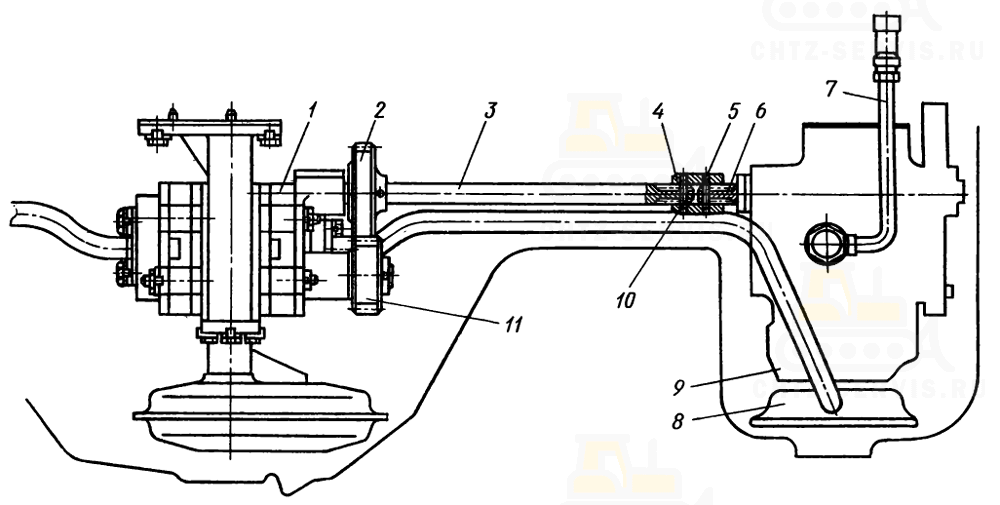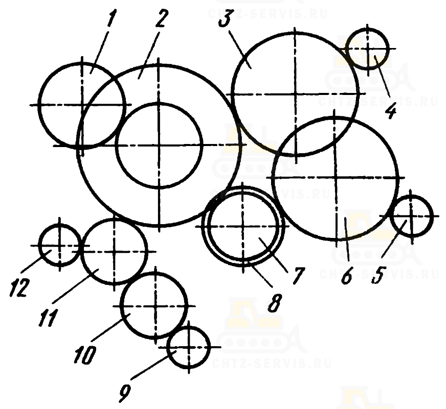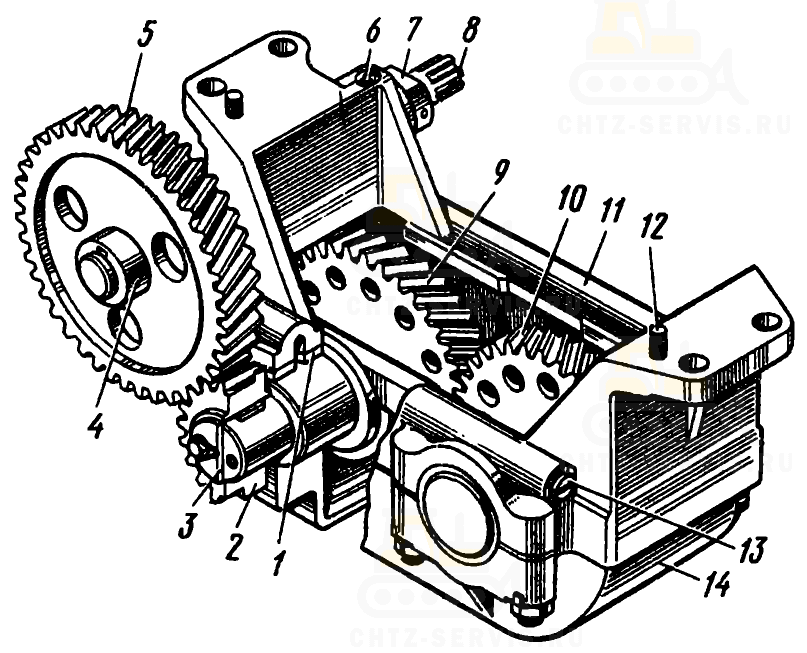 12 — трубка подвода масла к втулкам промежуточной шестерни и уравновешивающего механизма,