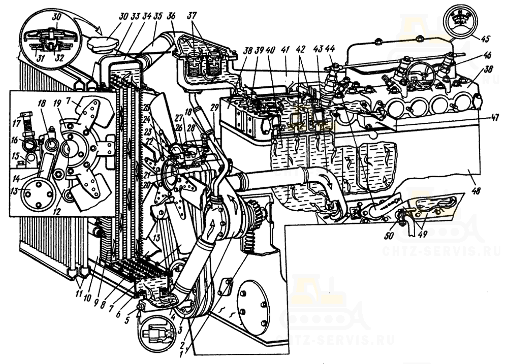 После запуска пускового двигателя, когда водяной насос 2 еще не работает, происходит термосифонная циркуляция воды. Нагретая в водяной рубашке пускового двигателя вода поднимается и по отводящей трубе 47 поступает в водяные рубашки головок дизеля и в сообщающуюся с ними водоотводную трубу. При закрытых клапанах термостатов 37 вода поступает по перепускной трубе 29 во всасывающую полость водяного насоса. Из полости водяного насоса холодная вода поступает в рубашку пускового двигателя на место поднявшейся нагретой воды по патрубкам 43 и 44.
