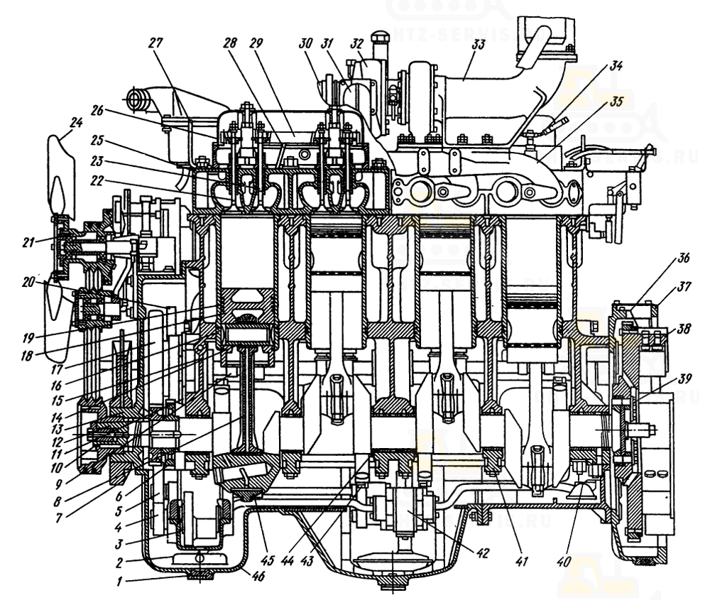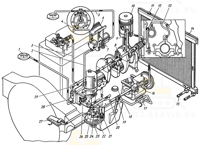 20 — маслопровод от центробежного масляного фильтра к масляному радиатору,