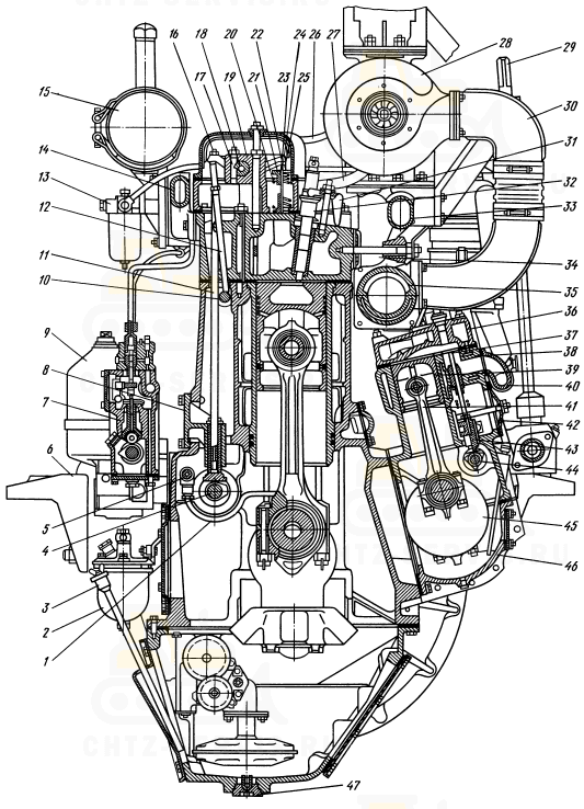 Двигатель состоит из кривошипно-шатунного механизма, механизма газораспределения, систем охлаждения, смазочной, питания, пускового устройства и агрегатов электрооборудования (рис. 3 и 4).