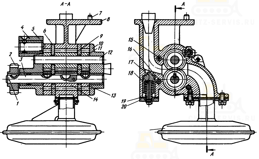 К всасывающей полости нагнетательной секции прикреплен центральный маслоприемник. Корпус 8 этой секции имеет фланец для крепления насоса к нижней плоскости блока. При установке насоса канал на привалочной плоскости фланца совпадает с отверстием в блоке, по которому масло попадает от нагнетательной секции в масляную магистраль. В корпусе нагнетательной секции находится предохранительный клапан 17 с пружиной 18. При достижении определенного давления масла в нагнетательной полости клапан открывается и перепускает масло в картер, ограничивая давление, развиваемое насосом. Давление масла регулируют прокладками 19.