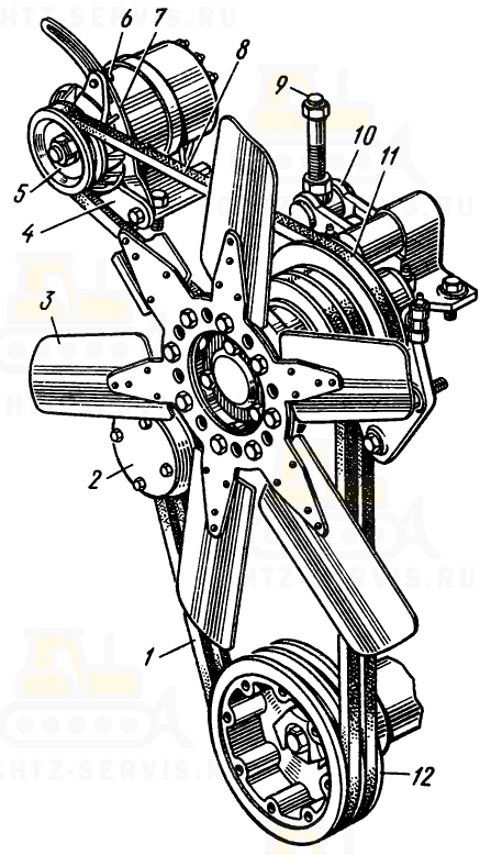 Для натяжения ремней вентилятора нужно отпустить контргайку регулировочного винта 9 (см. рис. 15) и вращать винт до тех пор, пока прогиб ремня (при нажатии с усилием 40 Н) не будет достигать 8—14 мм. Необходимо помнить, что слабо натянутые ремни вентилятора при работе будут бить о шкивы и сильно изнашиваться, вызовут буксование, при котором произойдет перегрев двигателя. Слишком сильно натянутые ремни приведут к большим усилиям в подшипниках и напряжению в ремнях.