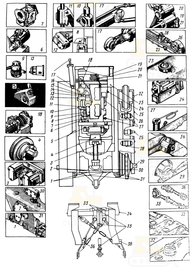 | 33, 34, 35, 36 | Раскосы, вилки, центральная тяга и рычаги механизма задней навески *** | 10 | Смазка «Литол-24» | Смазывают через каждые 60 ч через масленки на раскосах, вилках центральной тяги и рычагах до появления смазки |