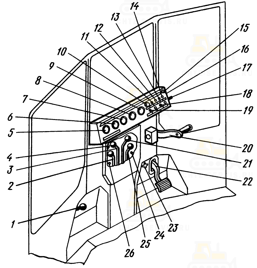 2 — рычаги распределителя гидронавески (гидросистемы навесного оборудования),