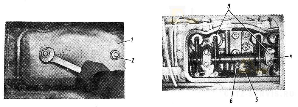Ослабьте стяжной болт 2 (рис. 52) рычага 4 и снимите рычаг с валика 3 декомпрессора. Отверните установочный винт 6, расположенный в передней части блока с правой стороны и фиксирующий в осевом направлении валик декомпрессора.