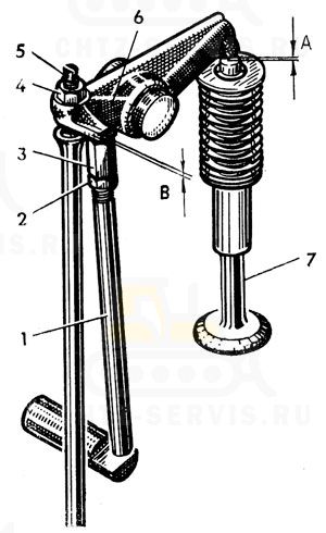 Отрегулируйте в клапанах первого цилиндра с помощью щупа зазор А (рис. 54) между коромыслом 6 и стержнем клапана 7, ослабив контргайку 4 и вращая регулировочный винт 5. Зазор должен быть 0,25... 0,33 мм для обоих клапанов. После регулирования затяните контргайку и вновь проверьте зазор.