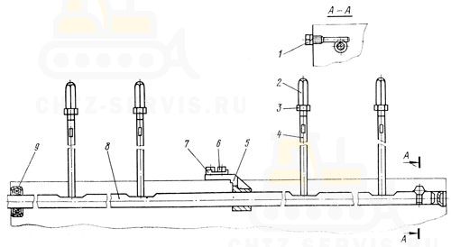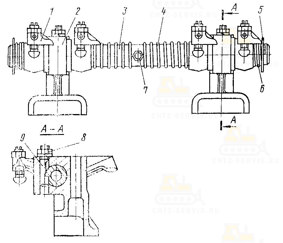 Отверните и снимите с валика коромысел 14-04-112сп штуцер 7 (рис. 50) для подвода смазки. Расшплинтуйте концы валиков и снимите с них концевые шайбы 5 и пружины 6. Снимите крайние коромысла 1. Отверните гайки 8 стопоров валика в стойках коромысел и выньте стопоры 9 из стоек. Снимите с валиков 3 стойки 2 коромысла клапанов и пружину 4.