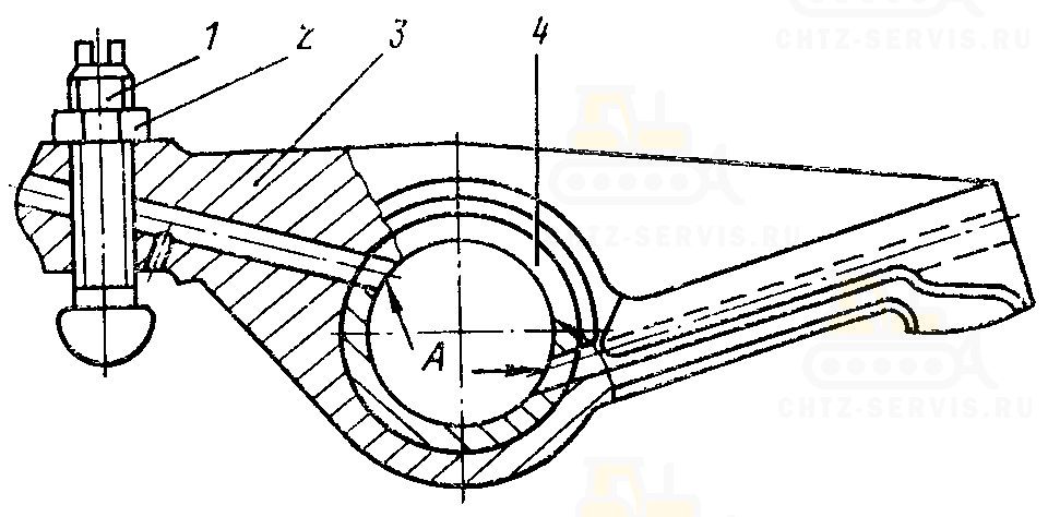 Отверните гайку 2 (рис. 51) регулировочного винт и выверните из коромысла винт 1. Выпрессовывайте втулки 4 из коромысла 3 при предельном износе внутренней поверхности втулки или ослаблении ее посадки в отверстии коромысла.