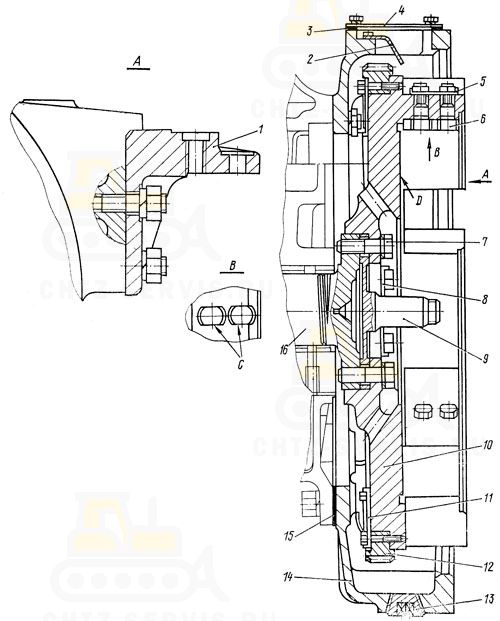 Маховик 16-03-111сп можно снять, не снимая дизель с трактора, предварительно удалив муфту сцепления. Снимите муфту сцепления, крышку 4 (рис. 61) люка и указатель 2, отвернув болты, крепящие их к кожуху 14 маховика.