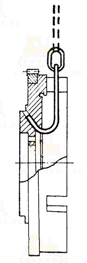 Зацепите маховик 10 подъемным приспособлением (рис. 62). Разогните усики замковых пластин 8 (см. рис. 61) и отверните, болты 7 крепления маховика к коленчатому валу 16 дизеля. Отсоедините маховик от фланца коленчатого вала 16-03-112сп, отведите назад и снимите с трактора. Масса маховика 126 кг. Выньте из маховика цапфу 9. Перед снятием нанесите метки на маховике, цапфе и фланце коленчатого вала. При последующей сборке установите эти детали в прежнее положение.